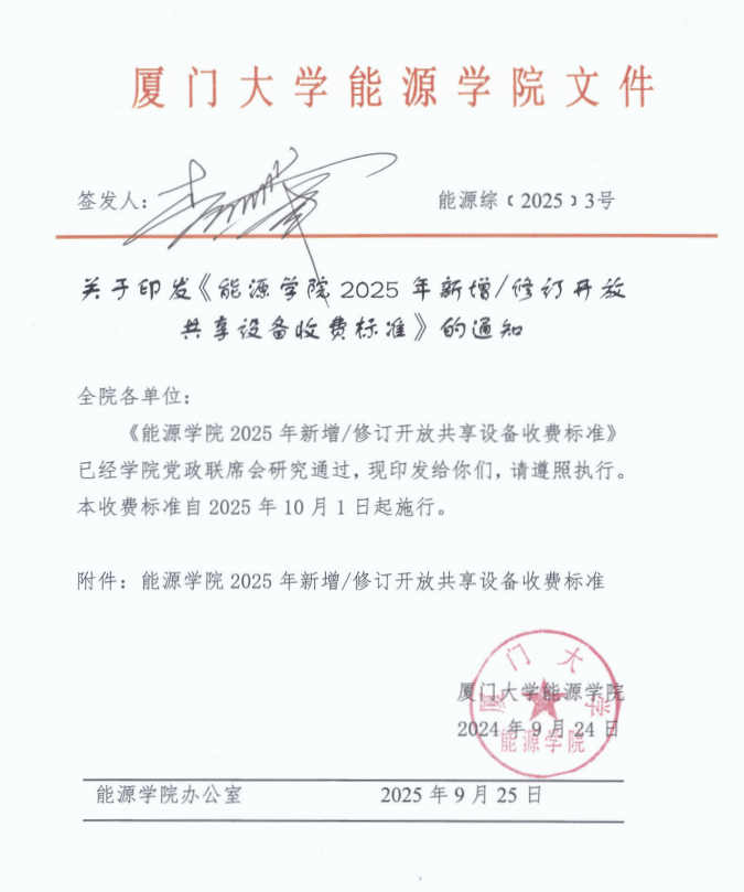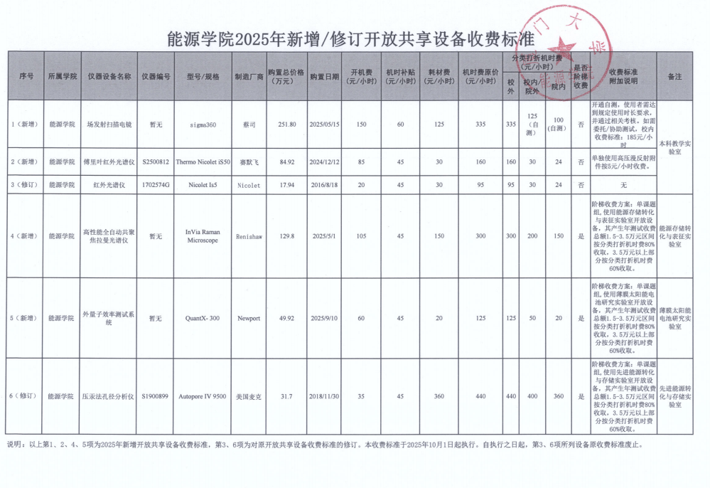 能源学院2025年新增(修订)开放共享仪器测试收费标准